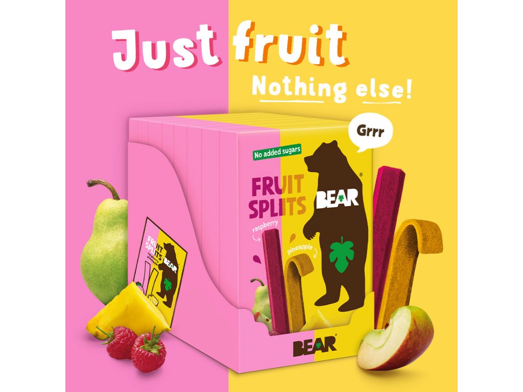 100% PŘÍRODNÍ SLOŽENÍ - vyrobeno pouze z ovoce a naprosto ničeho jiného. Nikdy ne z koncentrovaných džusů! Vychutnejte si skutečnou chuť ovoce s BEAR Fruit Splits. Ovocné svačinky bez umělých příchutí a barviv.