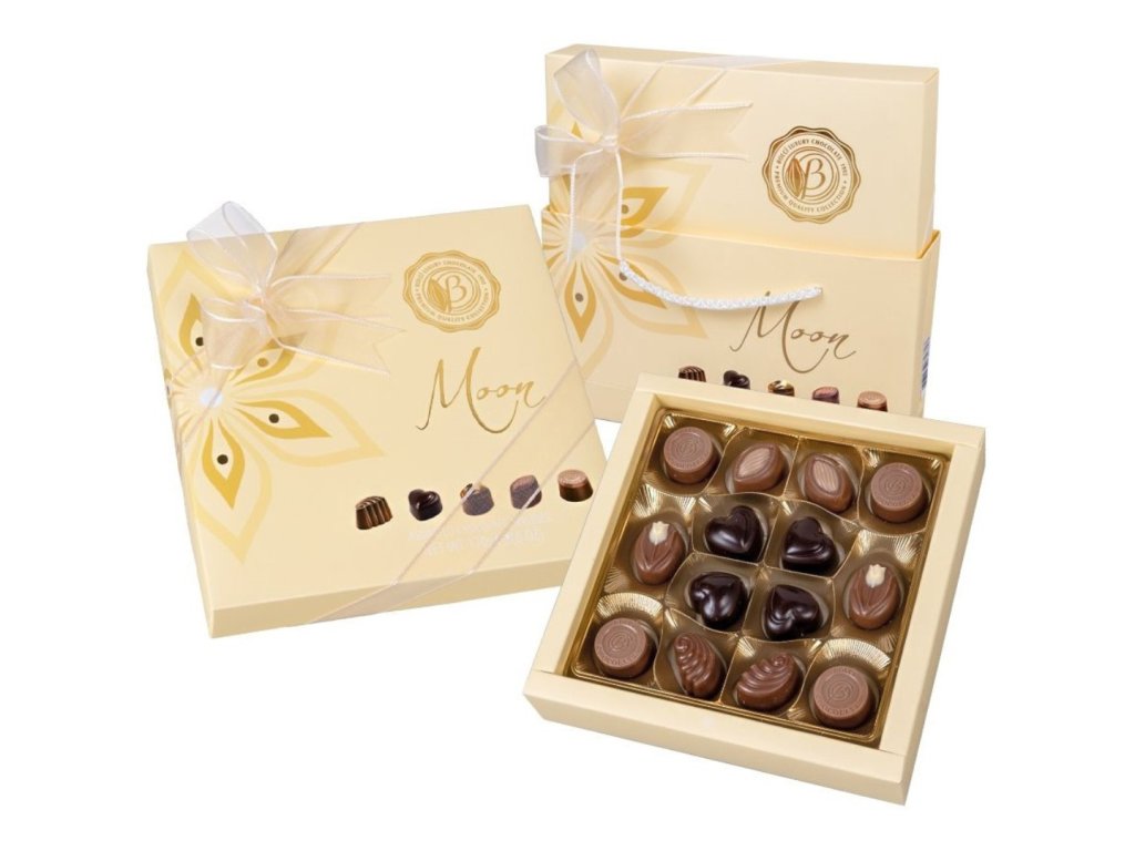 Mix pralinek ve veselé žluté krabičce? To je Moon Pastel od Bolci. Pestrost pralinek z mléčné, hořké i bílé čokolády s různými náplněmi – od oříškových nugátů přes cappuccino a karamelové ganache až po krokant a dražé.