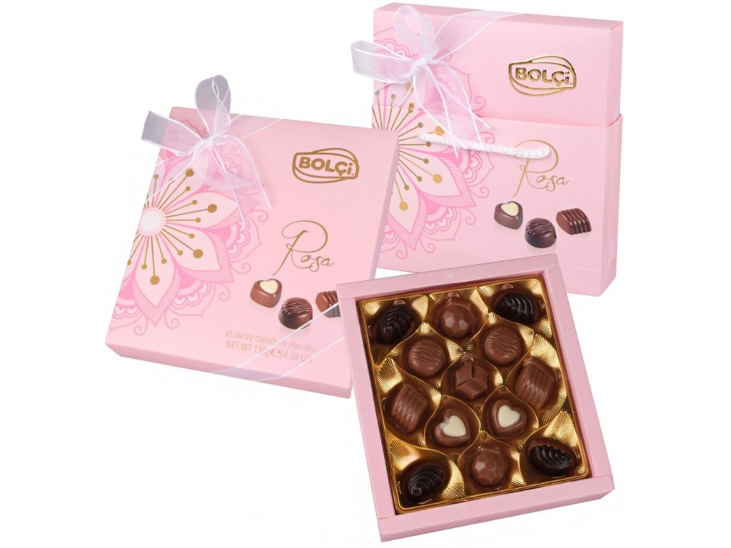 Mix pralinek v romantické růžové krabičce? To je Rosa Pastel od Bolci. Pestrost pralinek z mléčné, hořké i bílé čokolády s různými náplněmi – od oříškových nugátů přes cappuccino a karamelové ganache až po krokant a dražé.