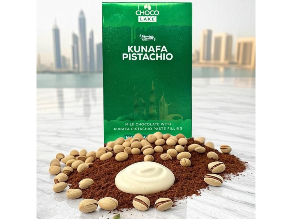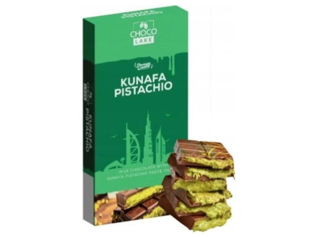 Choco Lake Dubai Chocolate je inspirovaná luxusem a exotickými chutěmi Blízkého východu. Jemná mléčná čokoláda skrývá uvnitř bohatou pistáciovou náplň a křupavé kousky kunafa těsta – tradiční blízkovýchodní delikatesy vyrobené z tenkých vláken pšeničného těsta, které se pečou dozlatova.