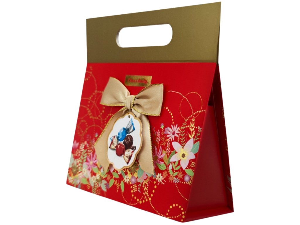 Červeno-zlatá kabelka s magnetickým zavíráním plná čokoládových pralinek? Tohle je dárek, co zaujme. Mix italských pralinek z mléčné i hořké čokolády s různými krémovými náplněmi v luxusním balení.