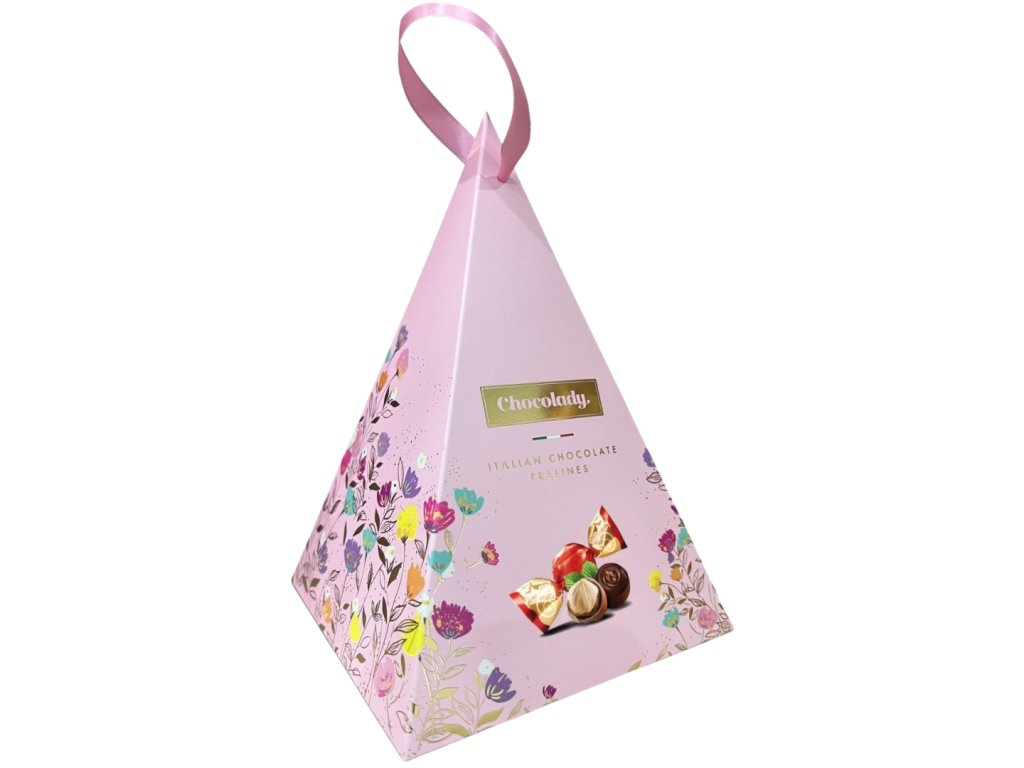 Lískooříškové pralinky v růžové pyramidě? Ano, prosím. Italská mléčná čokoláda s krémovou lískooříškovou náplní, která vypadá dobře a chutná ještě líp.