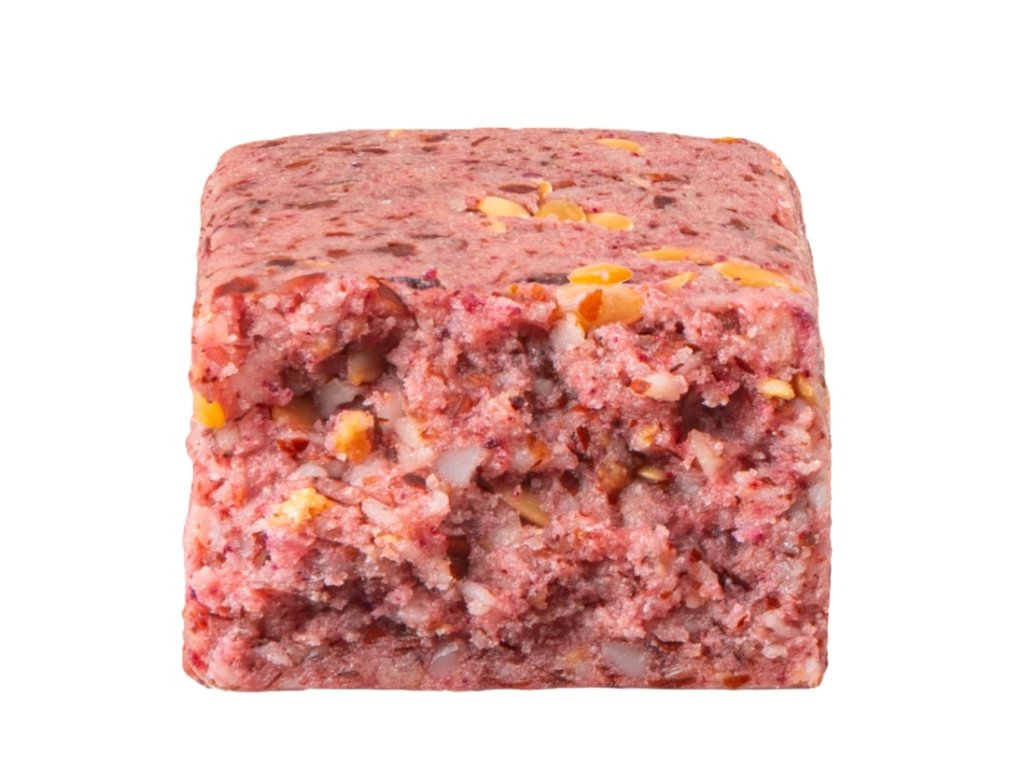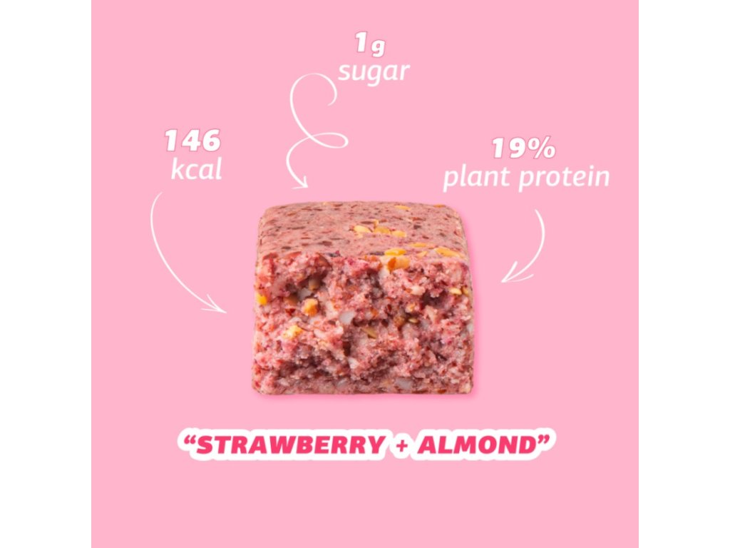 Mandle (48,9%), inulin, hrachový proteinový izolát (9,6%) (obsahuje 85% bílkovin), rostlinný glycerin, tapioková vláknina, sladidlo erythritol, lněná semínka (2,4%), lyofilizované jahody (1,3%), prášek z červené řepy, přírodní jahodové aroma.