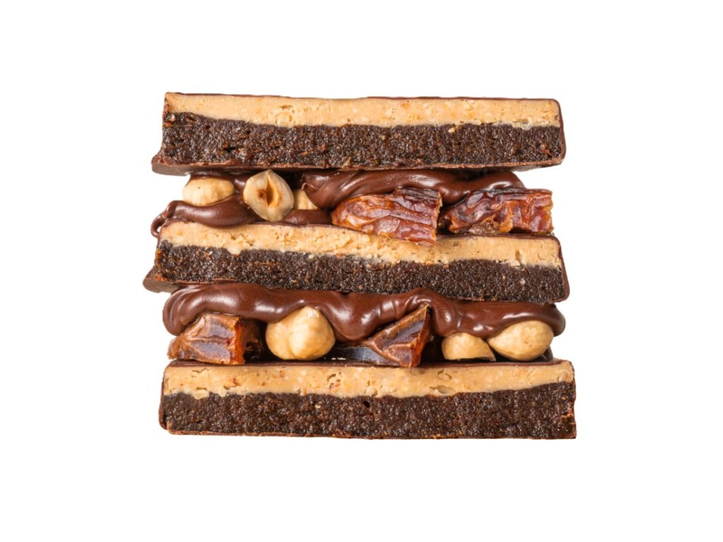 Datle (64,4 %), lískové ořechy (20,7 %), čokoládová poleva (11,1 %) (kakaová hmota, sladidlo maltitol, kakaové máslo, kakaový prášek se sníženým obsahem tuku, bambucké máslo, emulgátor lecitin, přírodní vanilkové aroma), bambucké máslo, růžová himálajská sůl.