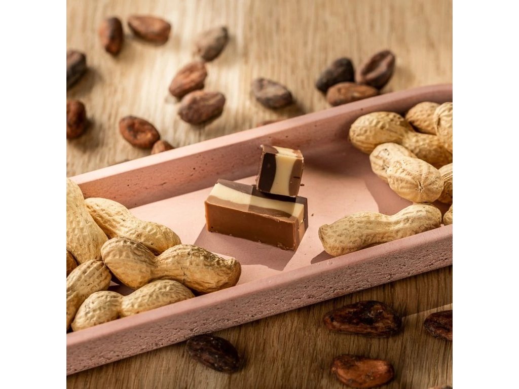 Arašídy (rozmělněné), bílá čokoláda, mléčná čokoláda, hořká čokoláda (kakaová hmota, kakaové máslo, cukr, sušené mléko, přírodní vanilka).