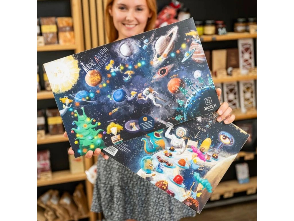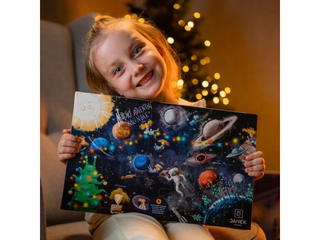 Objevíte tradiční vánoční motivy jako komety, sněhové vločky či dárečky, ale také ty, které vás zavedou na kosmickou cestu – romantické srdce symbolizující lásku k vesmíru, zářivé slunce, tajemné UFO nebo dokonce "zákeřnou" černou díru. Každý den přinese nové překvapení, které spojí vánoční radost s nekonečnou krásou vesmíru.