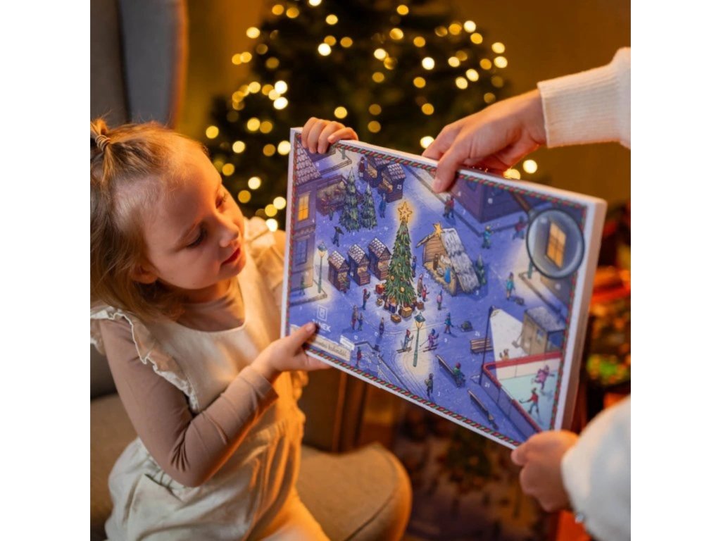 Adventní kalendář skrývá kouzelné překvapení za každým okénkem: očekávejte roztomilý stromeček, třpytivé baňky, něžného andělíčka, jemné vločky, veselého sněhuláka, zářivou kometu i zlatou hvězdičku.