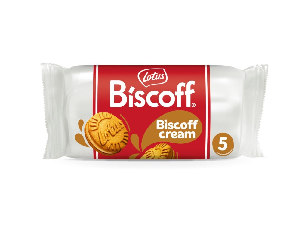 - Hladký Biscoff krém mezi dvěma křupavými sušenkami