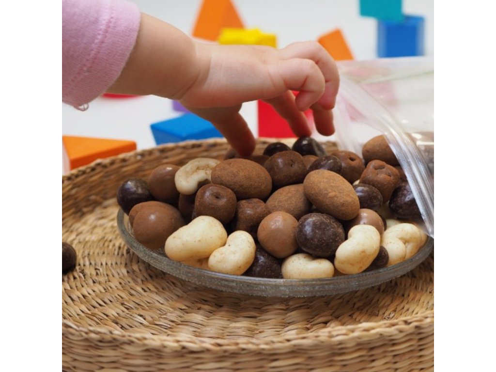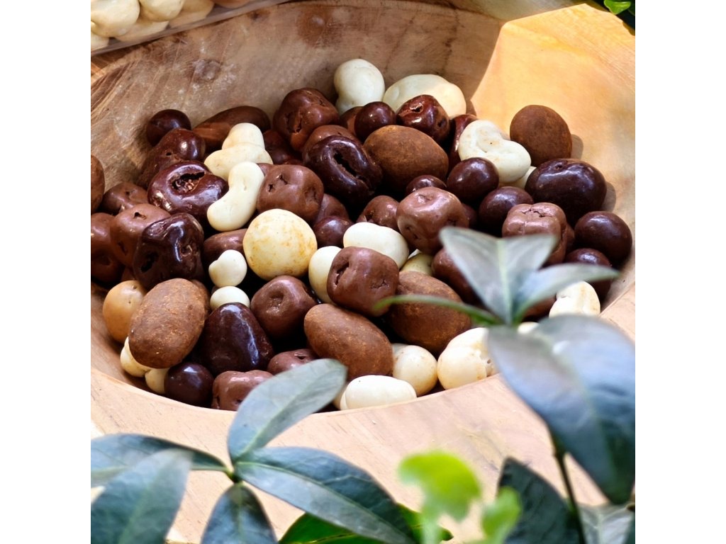 10 % kávové zrno v hořké čokoládě, 20 % višně v hořké čokoládě, 10 % lískové ořechy tříbarevné, 20 % mandle v mléčné čokoládě se skořicí, 20 % kešu v jogurtové polevě, 20 % kokosové kostky v mléčné čokoládě.