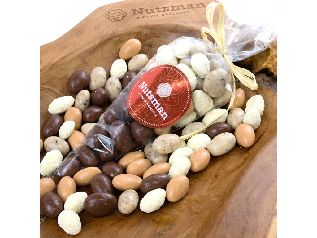 - Mandle v bílé čokoládě s kokosem „Raffaello“ – jemné, krémové a dokonale exotické. Sladká harmonie bílé čokolády a kokosu promění každé mlsání v malý tropický zážitek.