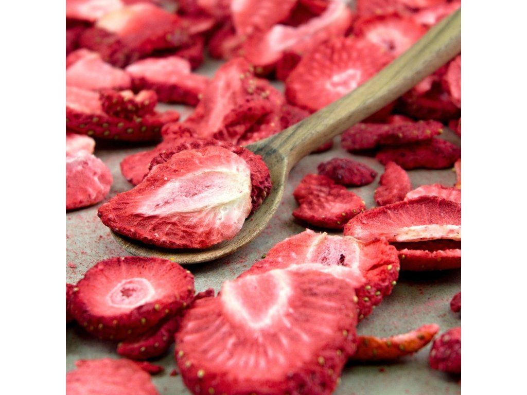 Možná to slovo zní složitě, ale princip je geniálně jednoduchý. Představ si, že jahody nakrájíš na tenké plátky, zmrazíš na extrémně nízkou teplotu a pak jim pomalu odčerpáš vodu. Ne horkem, ale šetrně, ve vakuu. Díky tomu si zachovají to, co na nich milujeme nejvíc – chuť, vůni, barvu a vitamíny. Je to jako kouzlo – jen vědecky ověřené.