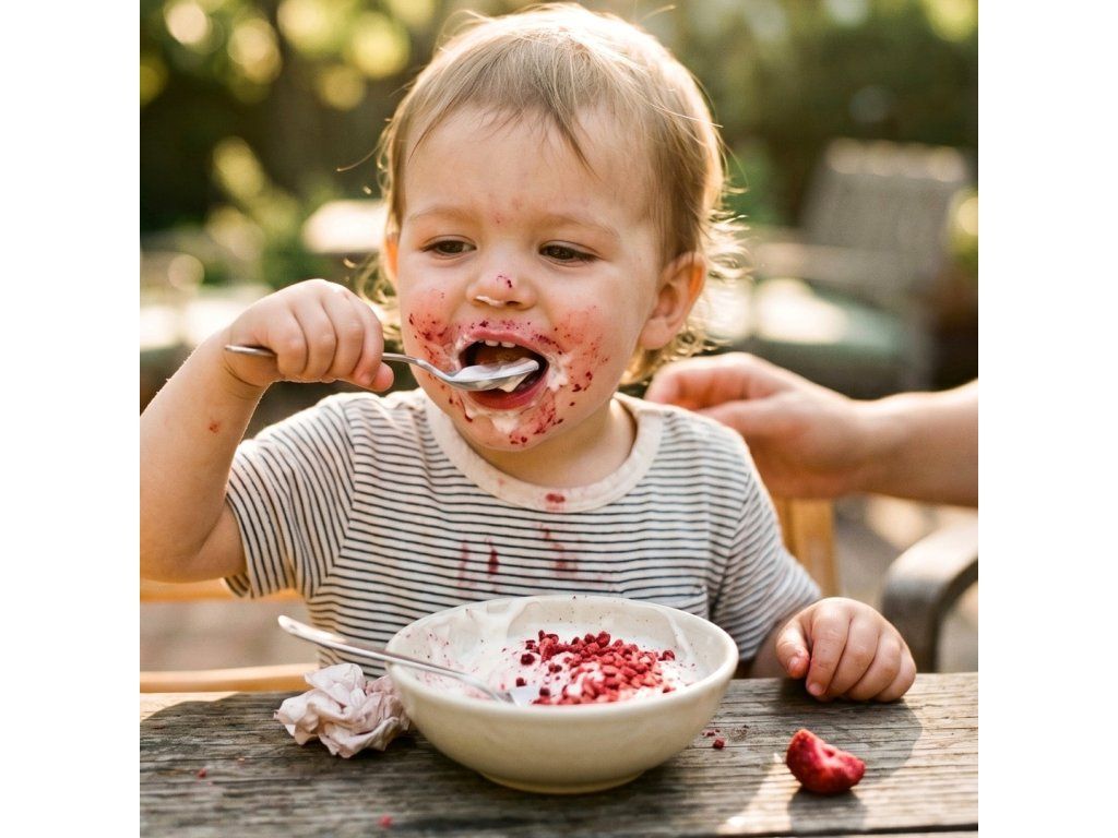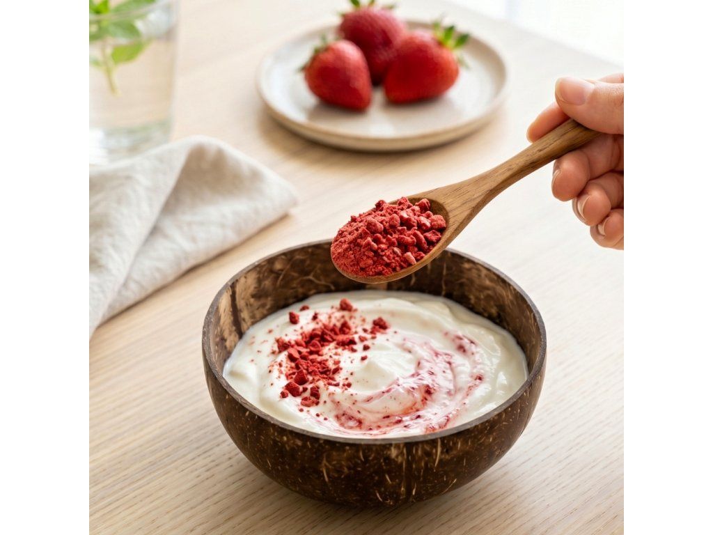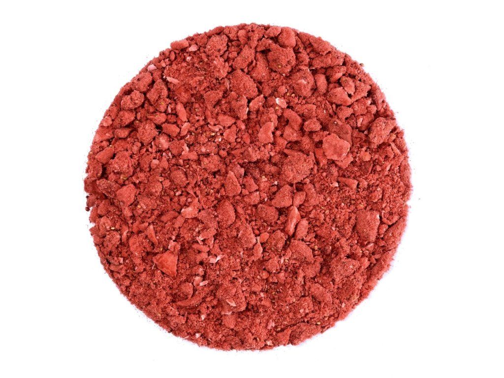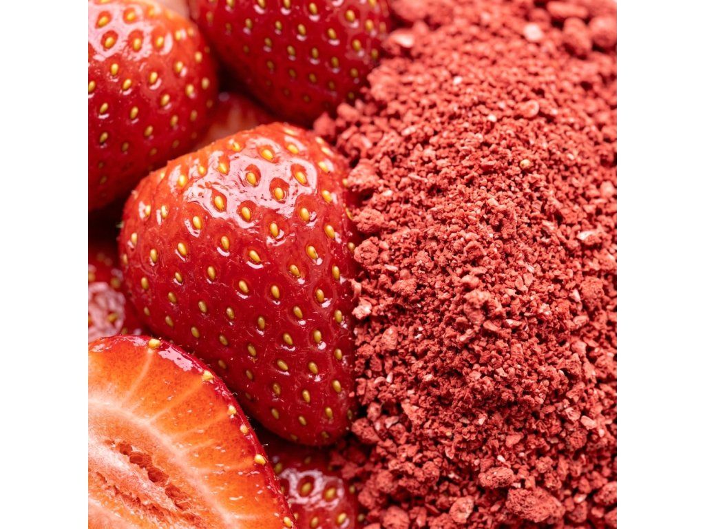 Je to čistá jahoda v té nejkoncentrovanější podobě. Jahody sušíme mrazem (lyofilizací), což je zbaví vody, ale nechá jim všechnu chuť, vůni, barvu i vitamíny. Pak je šetrně nadrtíme – žádné vaření, žádný cukr, žádná chemie. Jen čisté ovoce, které má sílu změnit každé sousto.