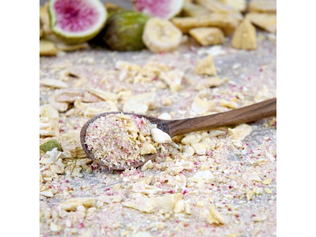 Tenhle mix fíků, banánu a ananasu je pro mě symbolem hřejivé sladkosti. Ale někdy chceš tu jeho medovou chuť a krásné barvy dostat i tam, kam se velké kusy ovoce úplně nehodí. Do krému, do těsta, nebo jen tak na ozdobu valentýnského dezertu, který chystáš pro někoho blízkého. A proto jsme vytvořili tuhle jemnou směs prachu a kousků.