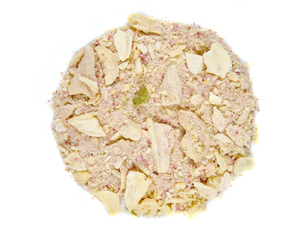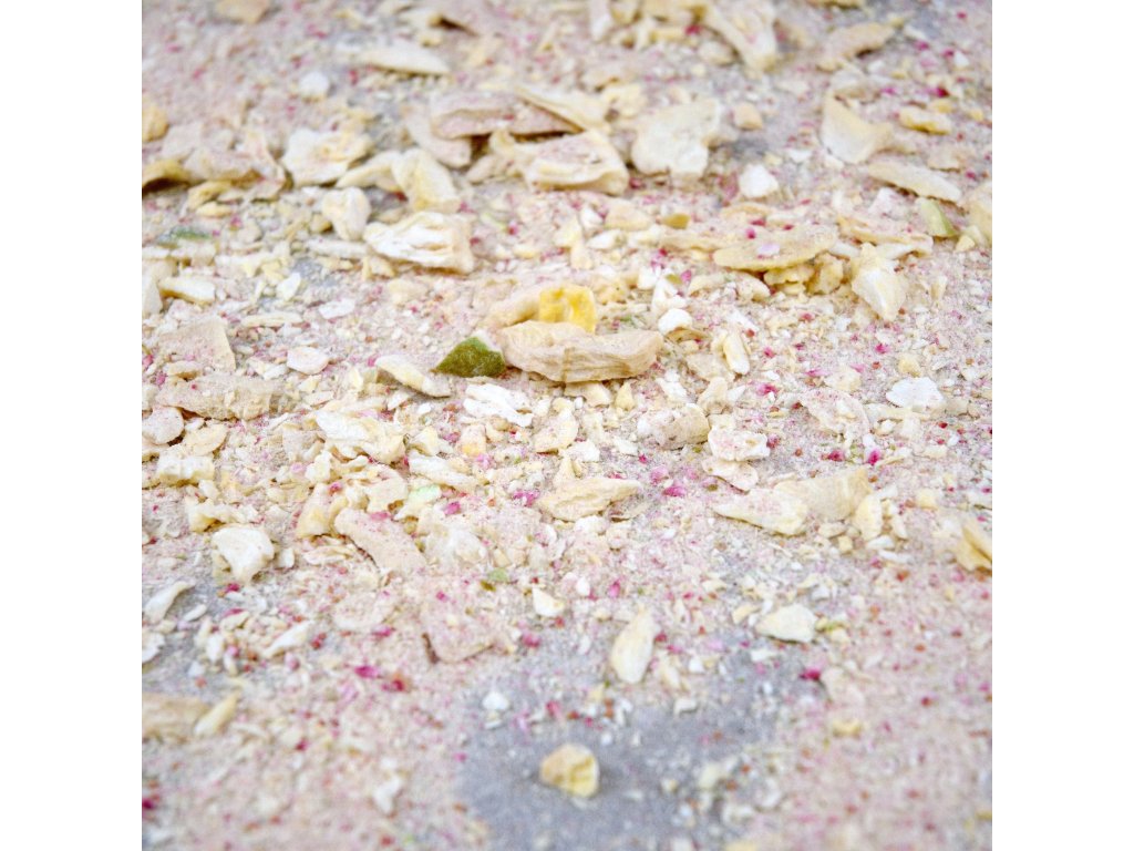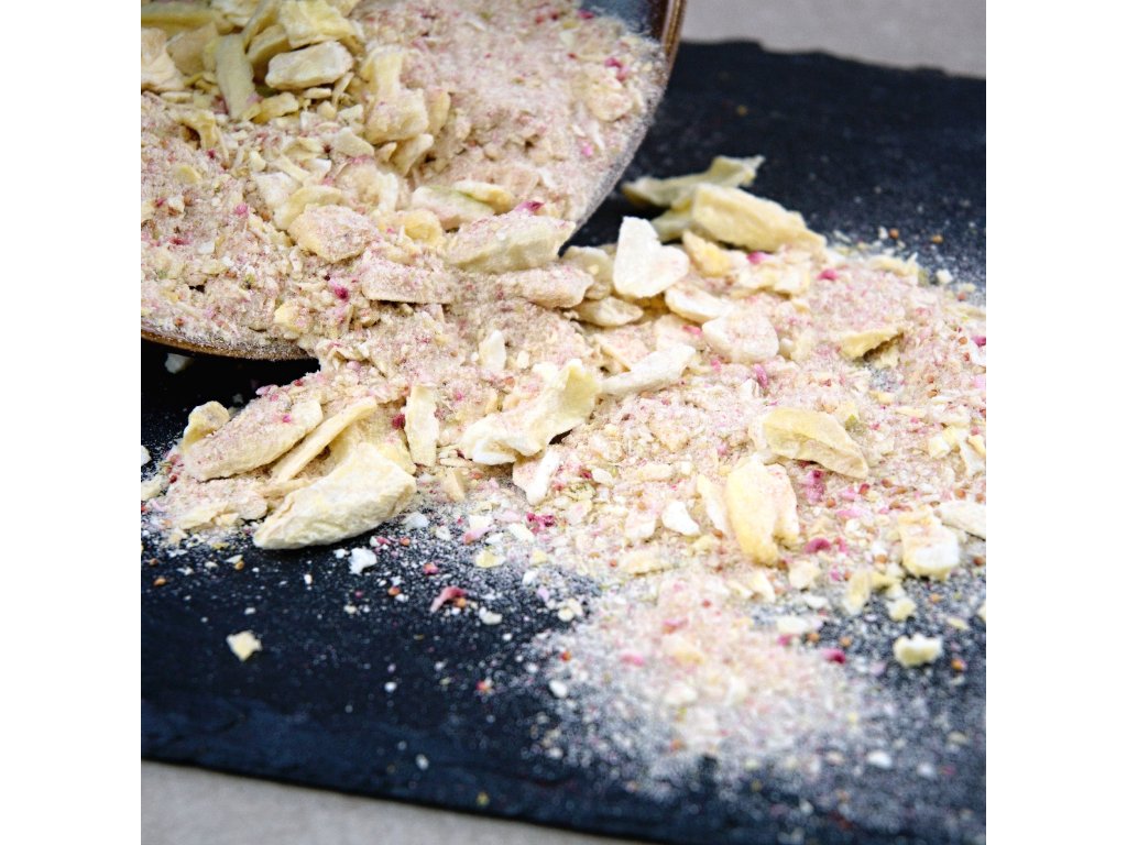 A abychom si rozuměli – tohle není žádný odpad z výroby. Je to naše prvotřídní lyo ovoce v té nejkoncentrovanější podobě. Jemný prášek plný chuti a drobné kousky, které dodají to správné křupnutí.
