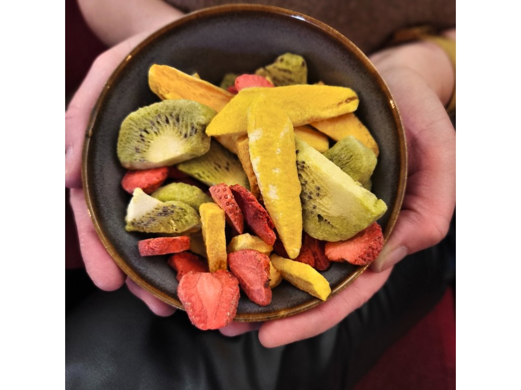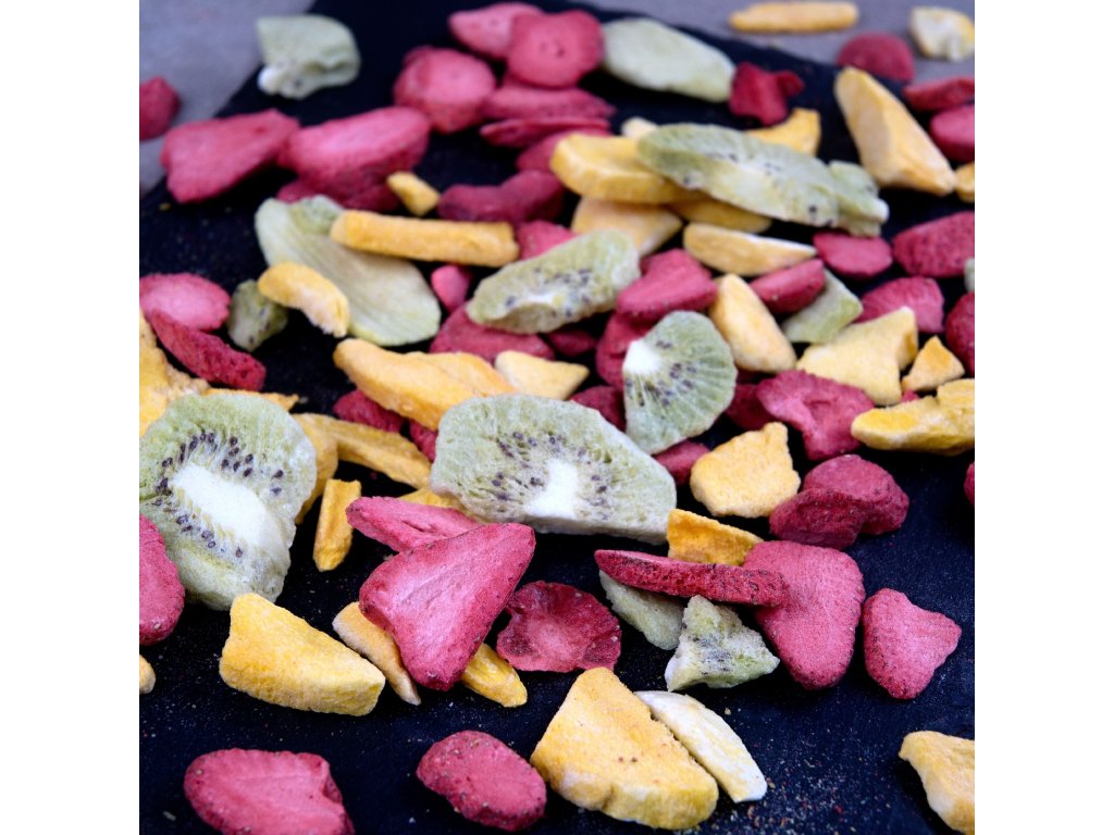 A aby bylo ovoce v tomhle mixu dokonale křehké a voňavé, sáhli jsme po lyofilizaci. Možná to slovo zní složitě, ale princip je geniálně jednoduchý. Představ si, že čerstvé ovoce zmrazíš na extrémní teplotu a pak mu pomalu odebereš vodu – ne jako při klasickém sušení horkem, ale šetrně, ve vakuu. Díky tomu si ovoce zachová to, co na něm milujeme nejvíc – chuť, vůni, barvu a vitamíny. Je to jako kouzlo – jen vědecky ověřené.