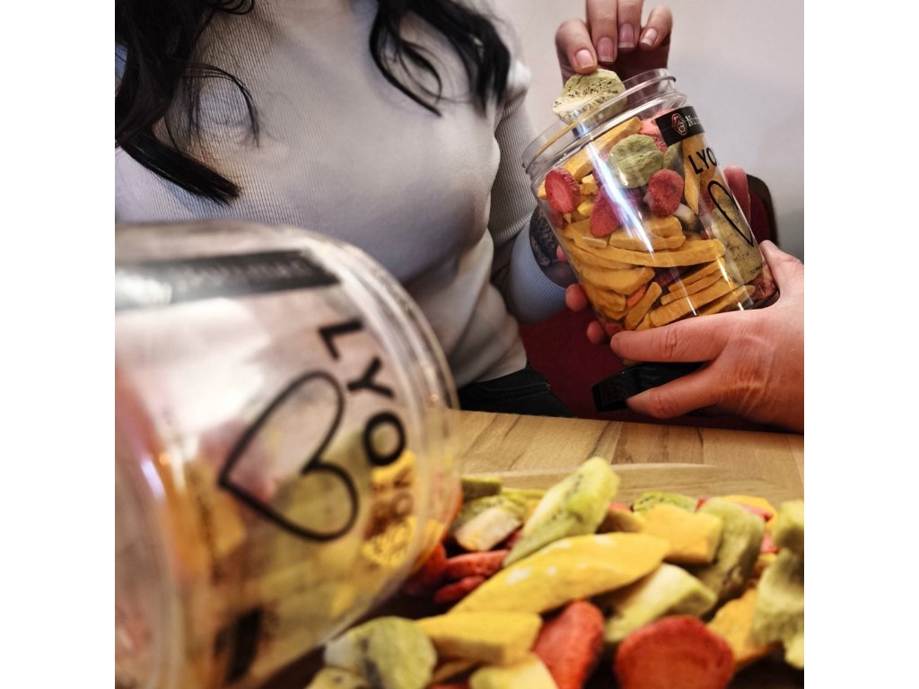 Vždycky mě fascinovalo, kolik radosti dokáže udělat trocha barev a poctivá chuť ovoce. Právě proto jsem pro letošního Valentýna namíchal tuhle směs lyo jahod, manga a kiwi a schoval ji do průhledné dózičky. Chtěl jsem, aby bylo hned vidět tu radost a barvy, ale hlavně, aby se ty křehké kousky cestou k tobě nerozbily. V dózičce mají tyhle křehké plátky svůj klid a tobě udělají radost hned dvakrát – nejdřív barvami a pak tím nejlepším křupnutím. Je to malé vyznání, které projasní den i uprostřed února.