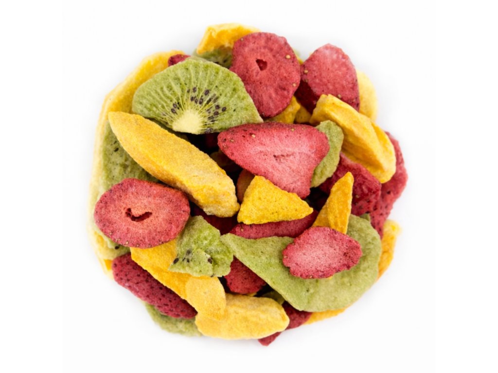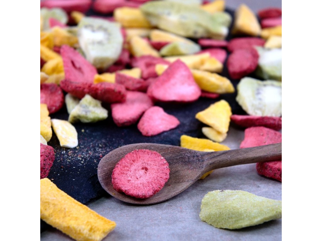 A aby bylo ovoce v tomhle mixu dokonale křehké a voňavé, sáhli jsme po lyofilizaci. Možná to slovo zní složitě, ale princip je geniálně jednoduchý. Představ si, že čerstvé ovoce zmrazíš na extrémní teplotu a pak mu pomalu odebereš vodu – ne jako při klasickém sušení horkem, ale šetrně, ve vakuu. Díky tomu si ovoce zachová to, co na něm milujeme nejvíc – chuť, vůni, barvu a vitamíny. Je to jako kouzlo – jen vědecky ověřené.