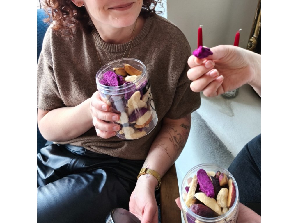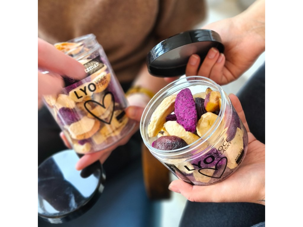 Vždycky mě fascinovalo, jak se k sobě můžou hodit chutě, které na první pohled vypadají úplně jinak. Právě proto jsem pro letošního Valentýna namíchal tuhle směs lyo švestek, jablek, banánu a dračího ovoce, která v sobě spojuje klid našeho sadu i špetku exotiky. Schoval jsem ji do velké průhledné dózy, aby bylo hned vidět tu radost a barvy. V dóze mají tyhle křehké kousky svůj klid a vám budou dělat radost pokaždé, když ji společně otevřete. Ovoce v ní zůstane pořád stejně křehké, jako byste ho právě načali.