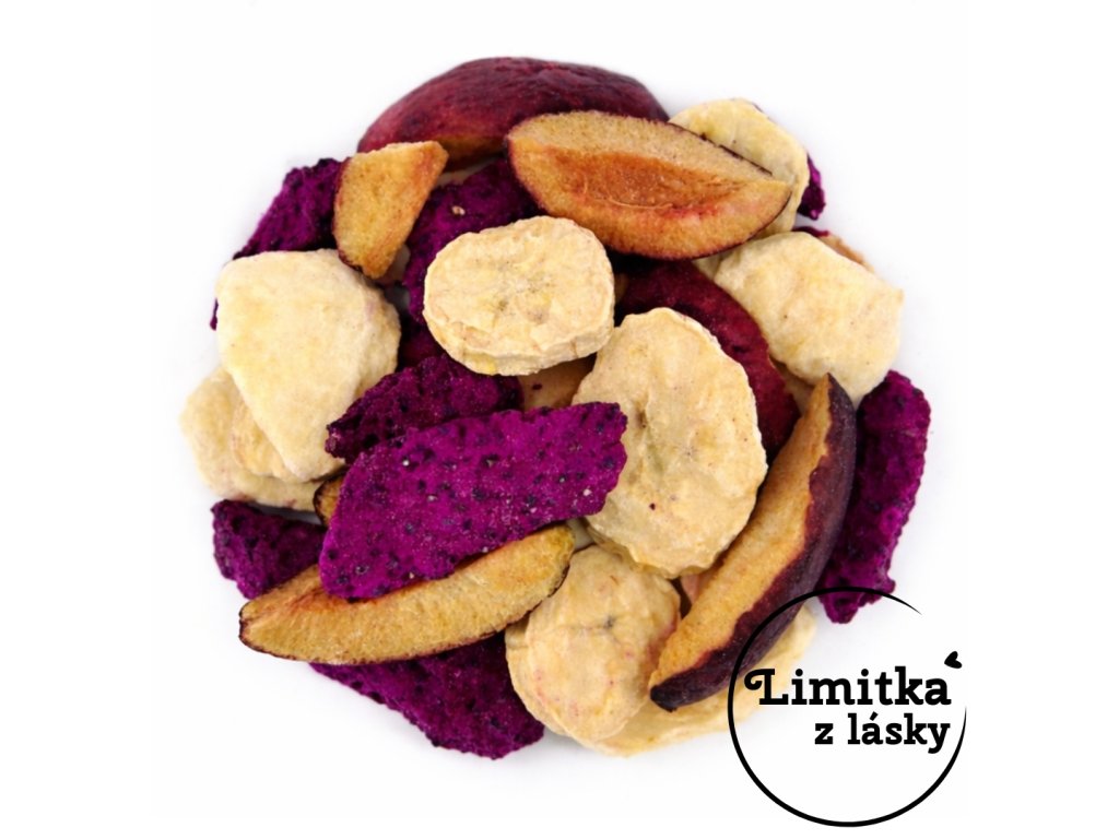Lyofilizované švestky měsíčky 25 %, lyofilizovaná jablka plátky 25 %, lyofilizované dračí ovoce plátky 25 %, lyofilizovaný banán plátky 25 %.