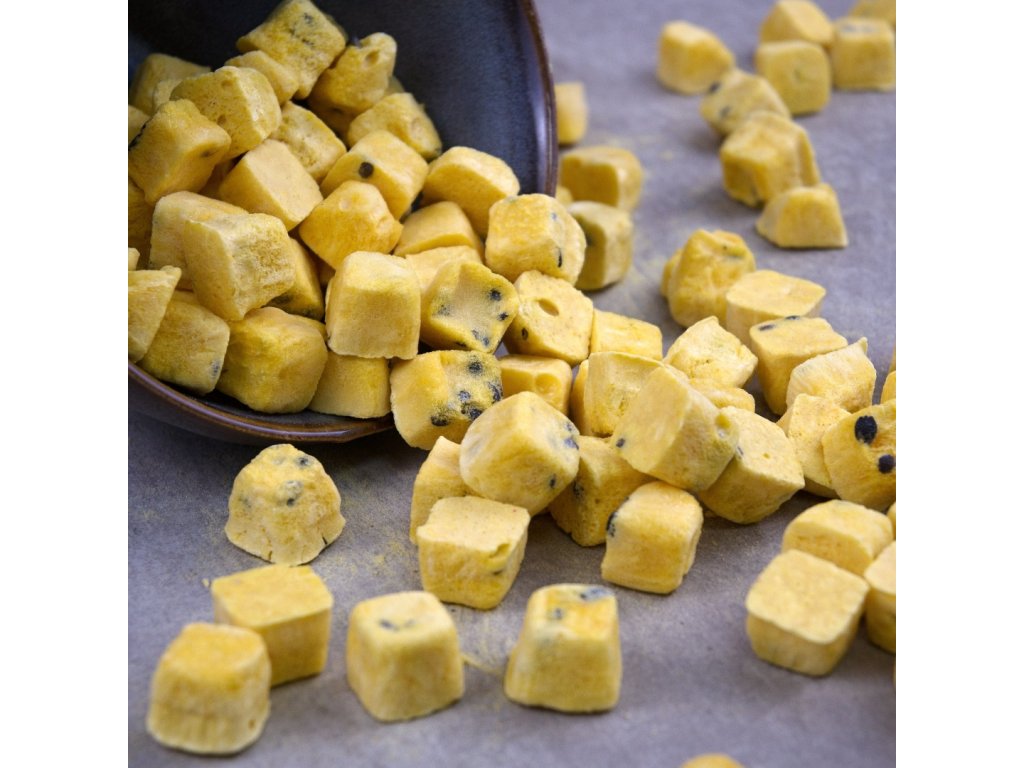 Představ si, že plody mučenky zmrazíš na extrémně nízkou teplotu a pak jim pomalu odčerpáš vodu – ne jako při klasickém sušení teplem, ale šetrně, ve vakuu. Díky tomu se voda změní rovnou na páru, aniž by maracuja ztratila to, co na ní milujeme nejvíc – její intenzivní chuť, tropickou vůni, barvu a vitamíny. Je to jako kouzlo – jen vědecky ověřené.
