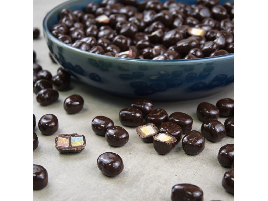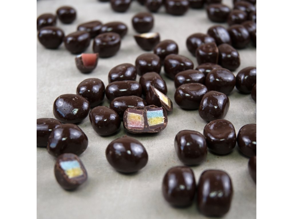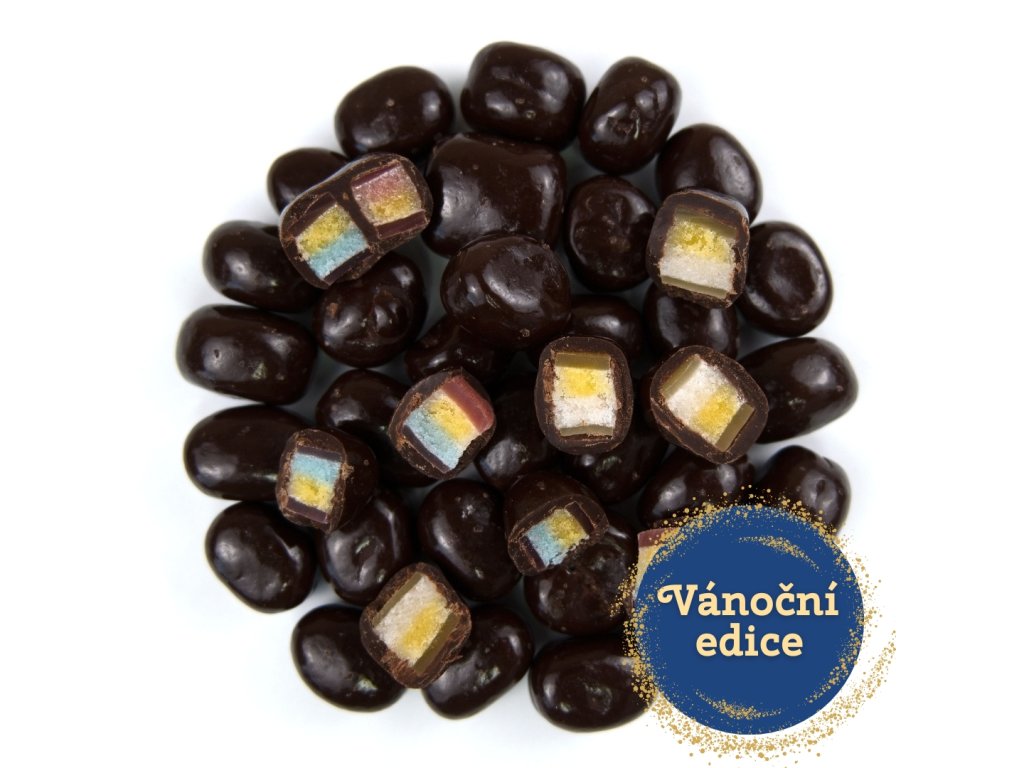 A přesně tuhle vzpomínku jsme chtěli oživit. Vzali jsme měkké želé s poctivou ovocnou příchutí a obalili ho do vrstvy kvalitní hořké čokolády. Takové, která pořádně křupne, když se do ní zakousneš, a pak se pomalu rozpustí na jazyku a odhalí svou intenzivní kakaovou chuť. A uvnitř? Ten barevný, červeno-žlutý vnitřek, který tě vrátí do dětství.