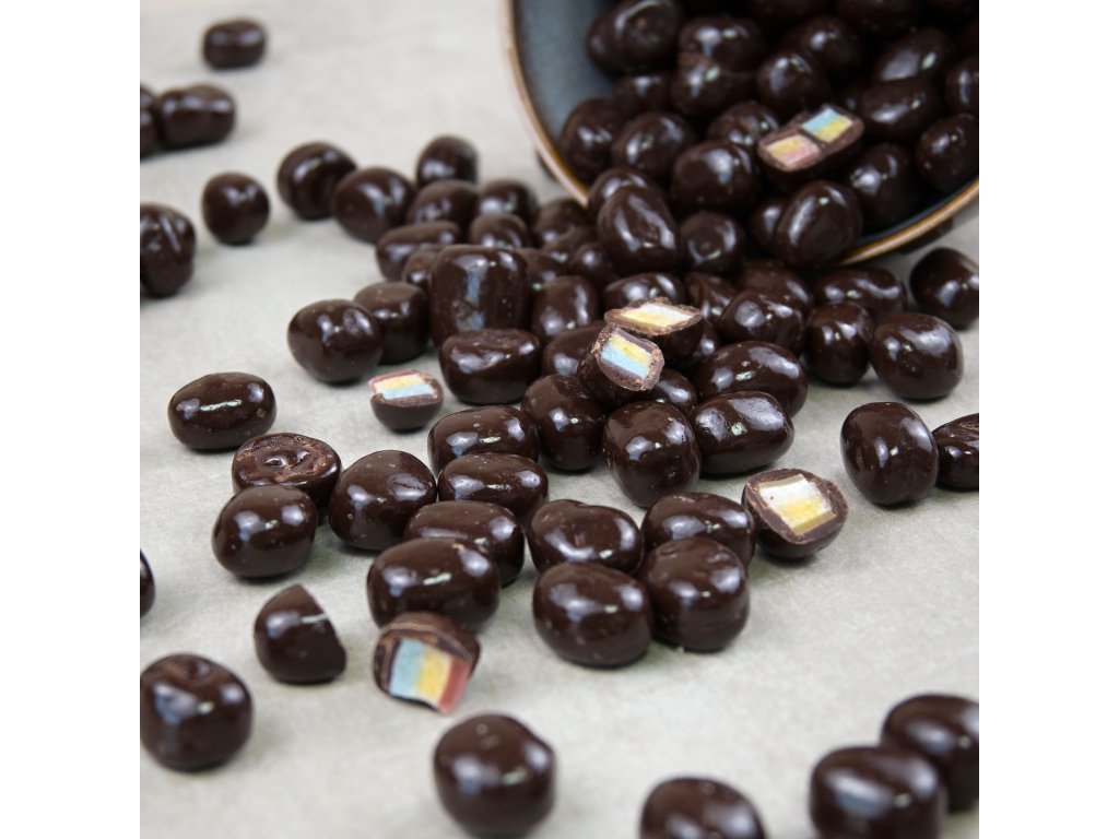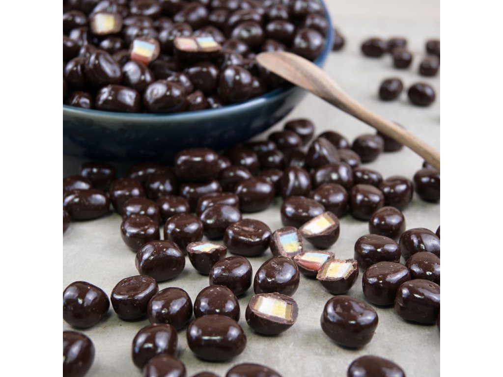 Vzali jsme měkké želé s poctivou ovocnou příchutí a obalili ho do vrstvy výrazné hořké čokolády. Ta při každém soustu nejdřív pořádně křupne a pak se začne pomalu rozpouštět na jazyku, kde uvolní svou kakaovou chuť. Ten kontrast sladkého ovoce a hořké skořápky je přesně to, co mě na nich baví.