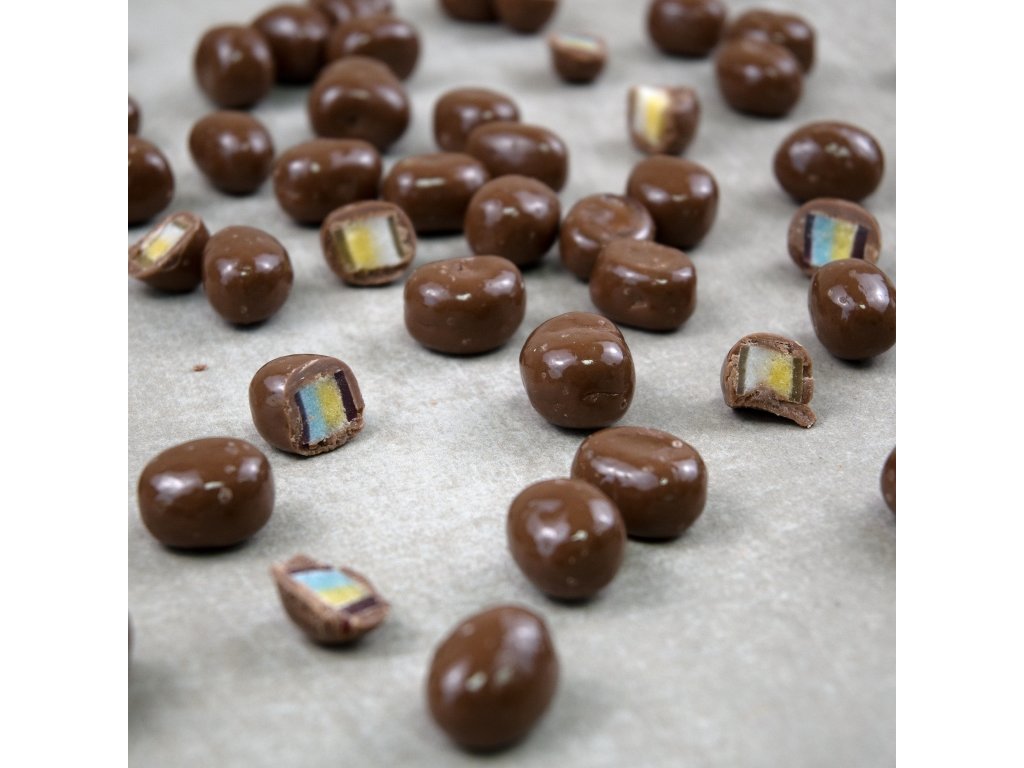 A přesně tuhle vzpomínku jsme chtěli oživit. Vzali jsme měkké želé s poctivou ovocnou příchutí a obalili ho do vrstvy jemné mléčné čokolády. Takové, která má krásně lesklý povrch, a když se do ní zakousneš, odhalí ten barevný, červeno-žlutý vnitřek. Je to sladké, ovocné a prostě klasika.
