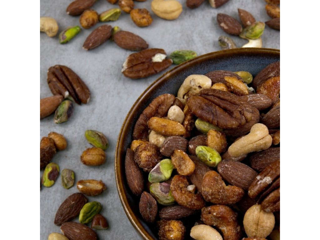 - Pečlivě vybrané oříšky – loupané pistácie, jemně pražené solené kešu, sladké pekany, uzené mandle a kešu s arašídy obalené v medu a soli.