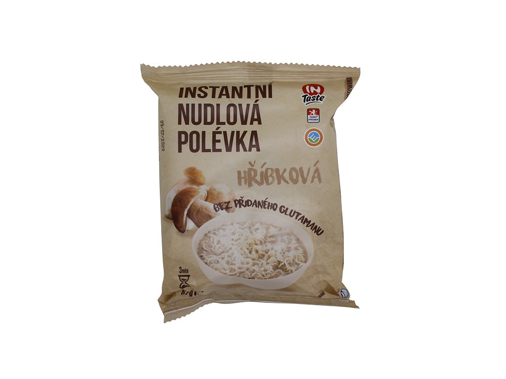 Složení: instantní bezvaječné nudle 82,1 % - pšeničná mouka, rostlinný tuk (palmový), jedlá sůl, cukr, regulátory kyselosti (uhličitany sodné, uhlisčitany draselné), zahušťovadlo (guma guar). Sypký kořenící přípravek 17,9 % - jedlá sůl, mouka pšeničná instantní, sušený tuk palmový (palmový tuk, glukózový sirup z pšenice, mléčná bílkovina), sušené odstředěné mléko, bílkovinný sójový hydrolyzát, sušená zelenina 8,2 % (cibule, česnek, karotka, petržel nať), cukr, laktóza, škrob bramborový, směs hříbkových hub 1,8 % (0,5 % hřib hnědý, klouzek obecný, křemenáč osikový, kozák březový), aromata (obsahují celer), směs koření, barvivo: amoniak-sulfitový karamel.