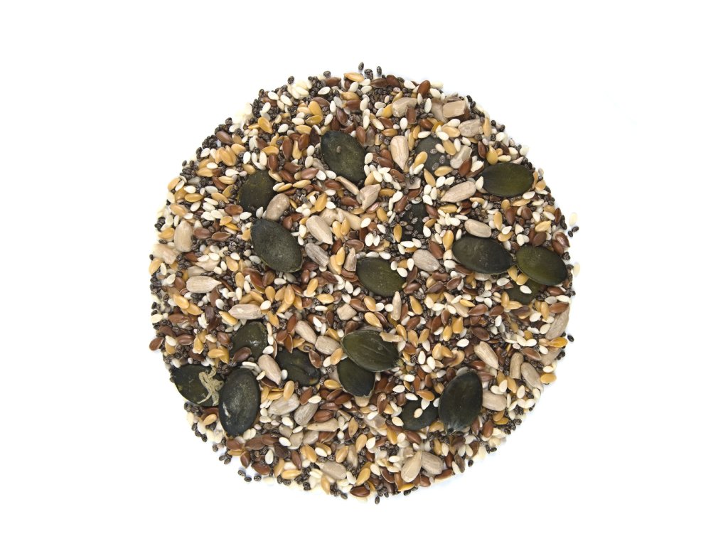 Slunečnicová semínka loupaná 20 %, Sezamová semínka loupaná 20 %, Lněná semínka zlatá 20 %, Lněná semínka hnědá 20 %, Dýňová semínka loupaná 10 %, Chia semínka 10 %.